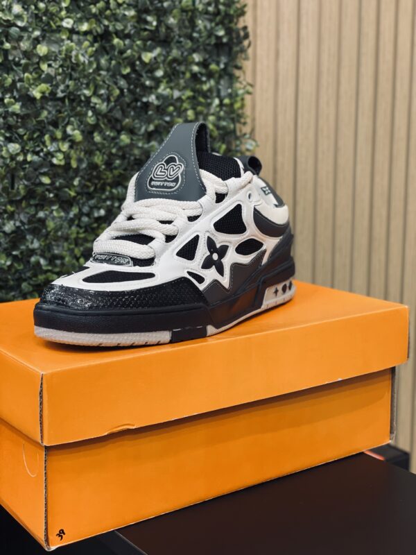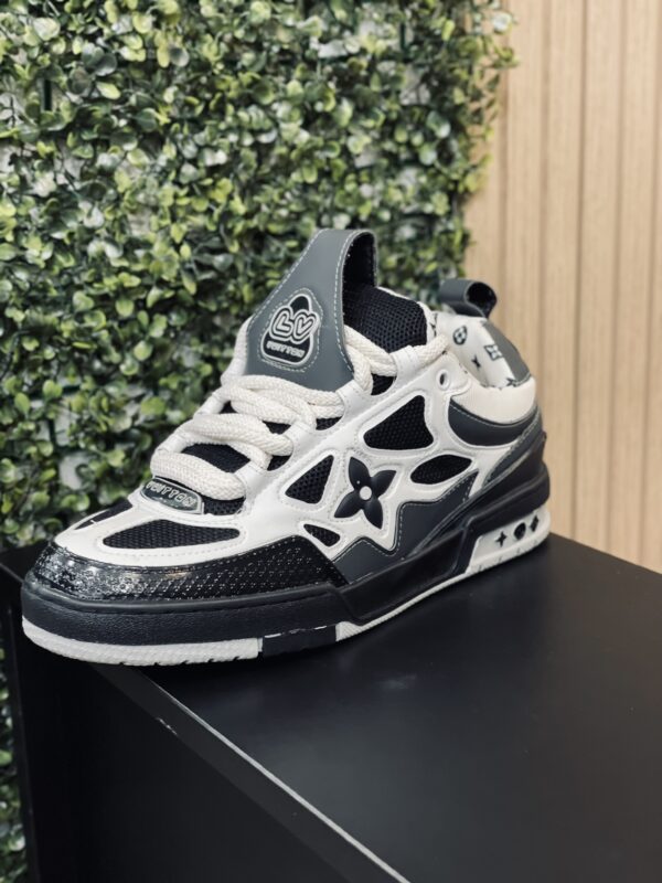 O tênis LV Skate traz um design inspirado nos anos 90 e foi visto pela primeira vez no desfile masculino Fall-Winter 2022 da Maison. Seu cabedal bicolor apresenta Flores do Monogram e combina malha tecnológica, couro de vitelo e camurça. Esse modelo se destaca pelo cano acolchoado, cadarços duplos tecnológicos e solado de borracha bicolor com Flores do Monogram.